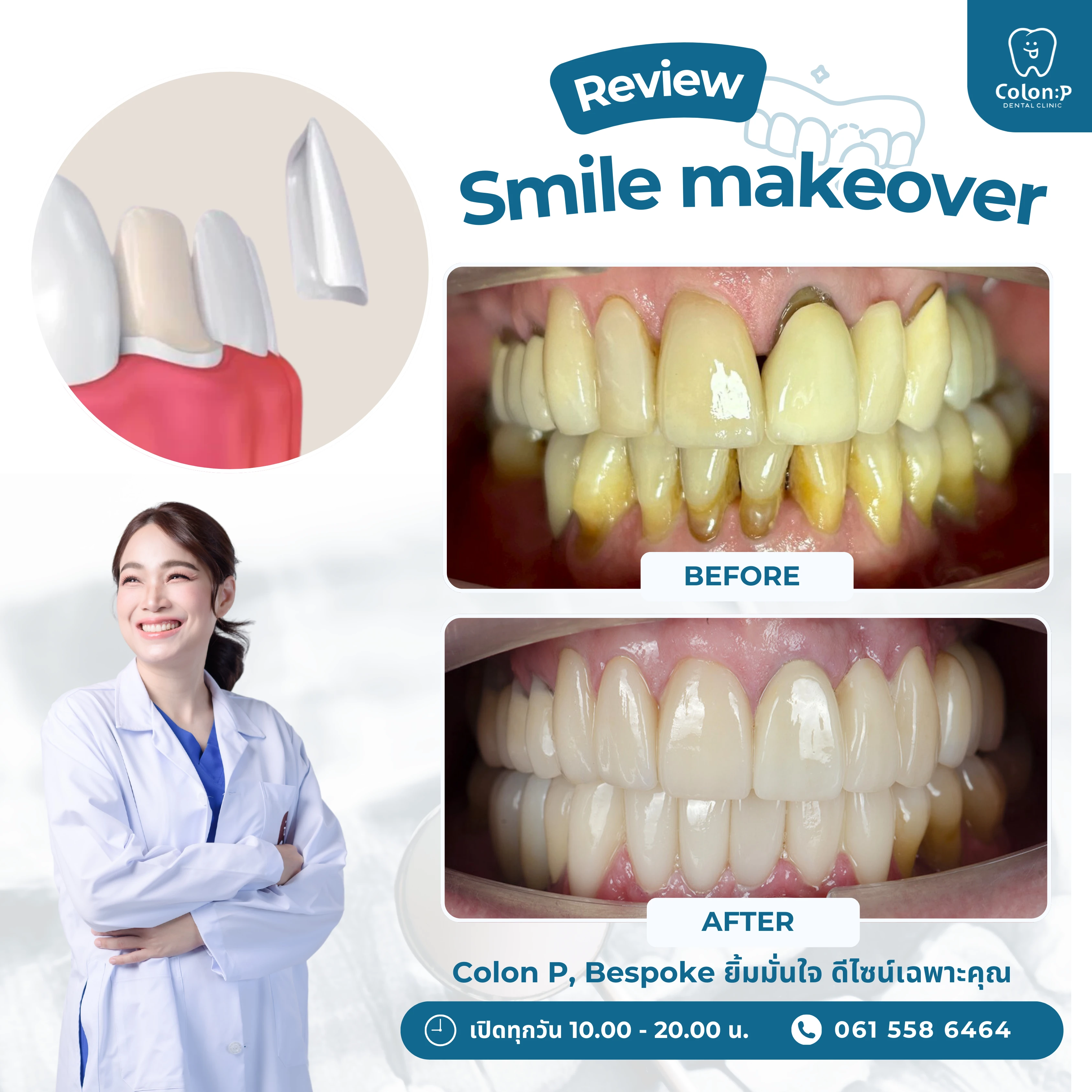 สนใจปรึกษาจัดฟันใสกับทันตแพทย์เฉพาะทางที่ โคลอน พี คลีนิก ได้แล้ววันนี้ โทร. 061 558 6464 หรือแชทเพื่อพูดคุยกับ Smile Consultant