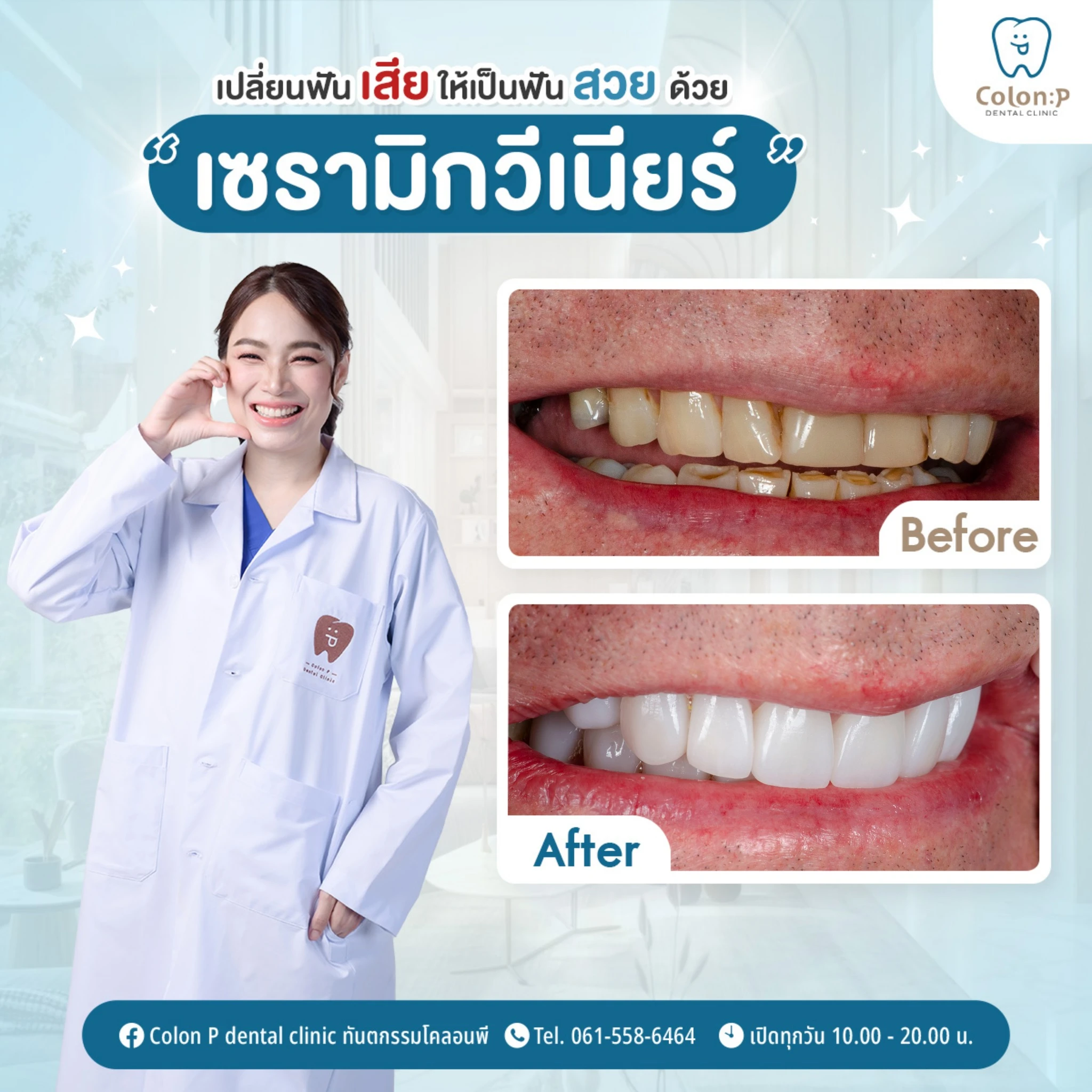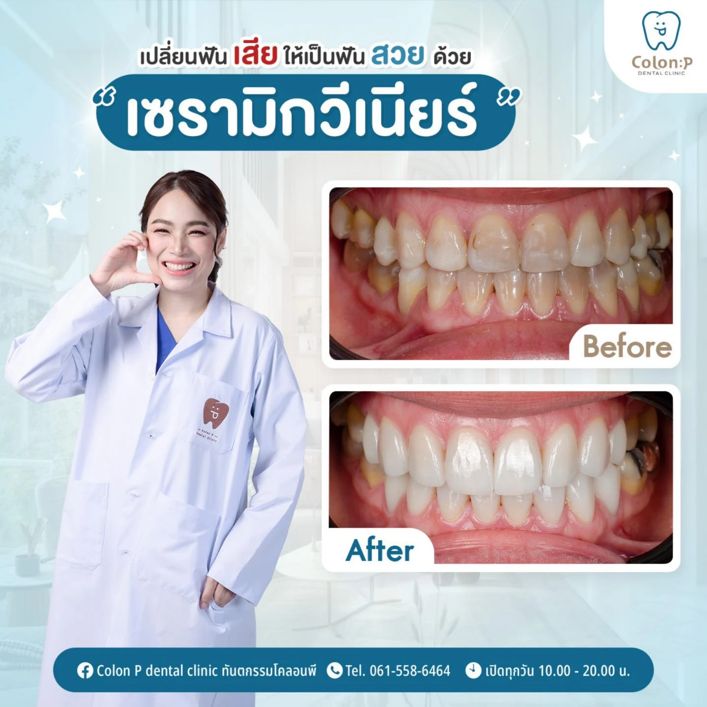 สนใจปรึกษาจัดฟันใสกับทันตแพทย์เฉพาะทางที่ โคลอน พี คลีนิก ได้แล้ววันนี้ โทร. 061 558 6464 หรือแชทเพื่อพูดคุยกับ Smile Consultant